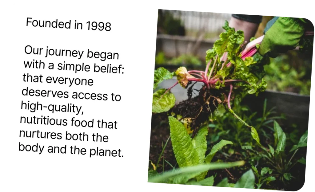 Sourced directly from local farmers who share our commitment to sustainable farming practices. We strive to make a positive impact on our community and the environment, ensuring that every step of our process, from seed to plate, is handled with care and respect for nature.